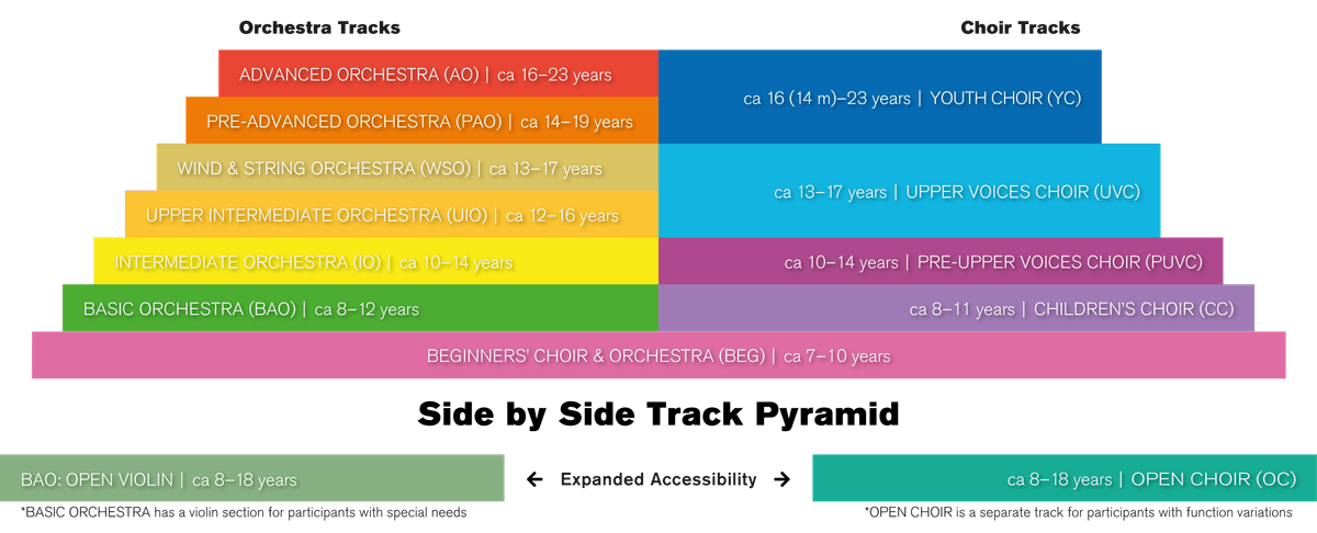 All young singers and musicians ca 7–23 years old are welcome to apply to Side by Side. Start by looking at the track pyramid for a quick overview of our age groups and levels, then visit the different track pages below. There you will find more information about each the specific track and link to the application info/application.